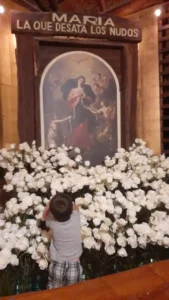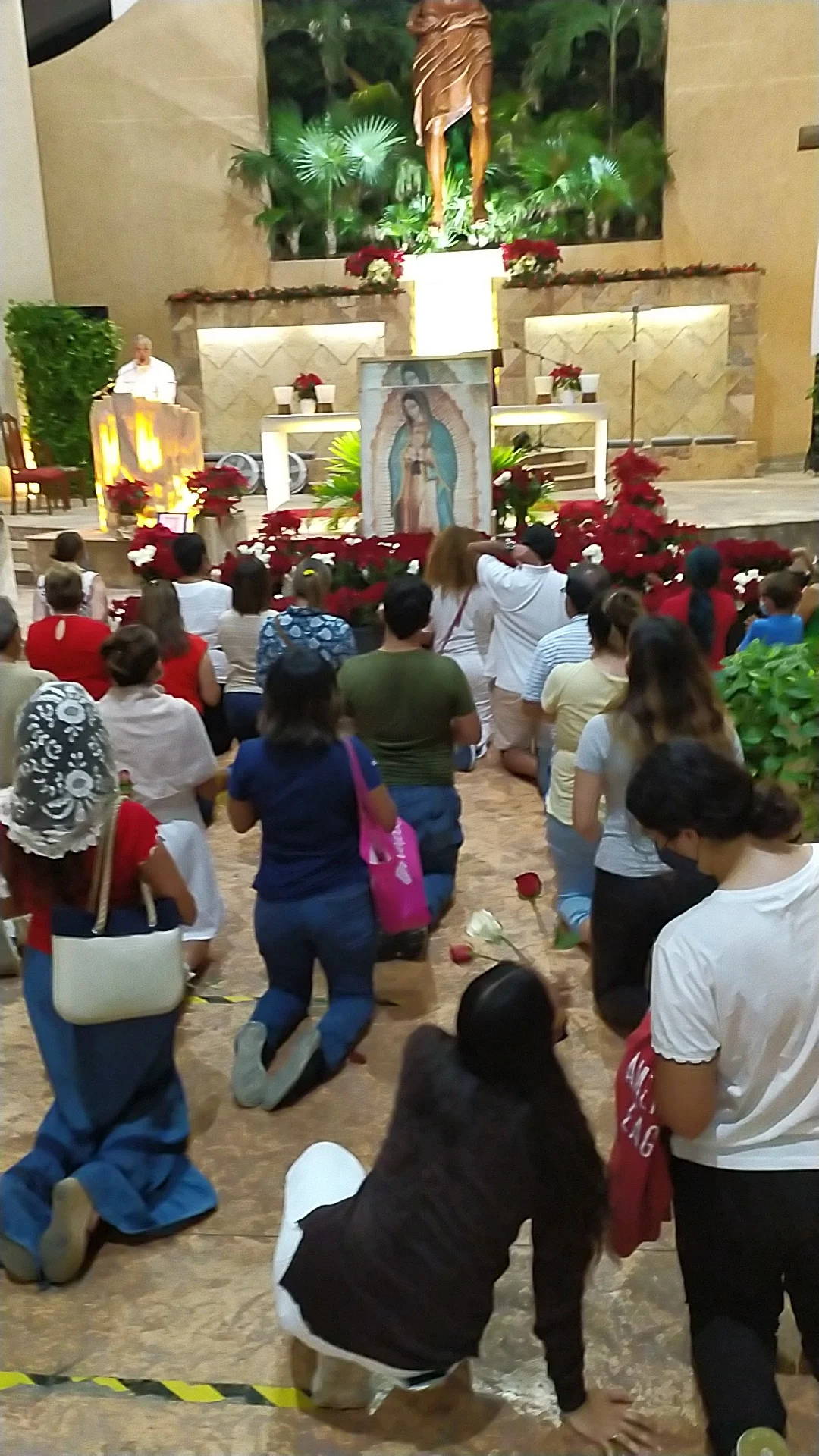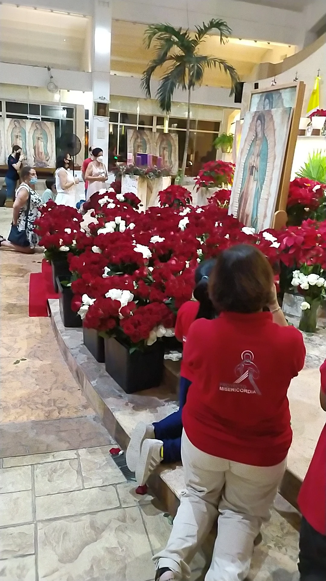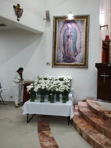 ▪ Cada ave María, una persona peregrina desde afuera de la iglesia con una petición y una rosa.